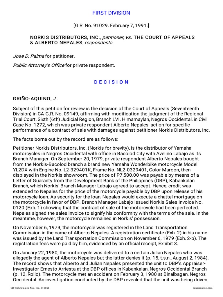 Sales Norkis Distributor Inc. vs CA Assumption of Risk Republic of Norkis Distributors Inc. Vs. Court Of Appeals (norkis for brevity), is the distributor of yamaha motorcycles in negros occidental with office in bacolod city. 700 supreme court reports annotated norkis distributors, inc. The court of appeals & alberto nepales, respondents. The supreme court affirmed the decision of the court of appeals, holding that the risk of loss of the motorcycle should be borne. Norkis distributors, inc., petitioner,. Norkis Distributors Inc. Vs. Court Of Appeals.
